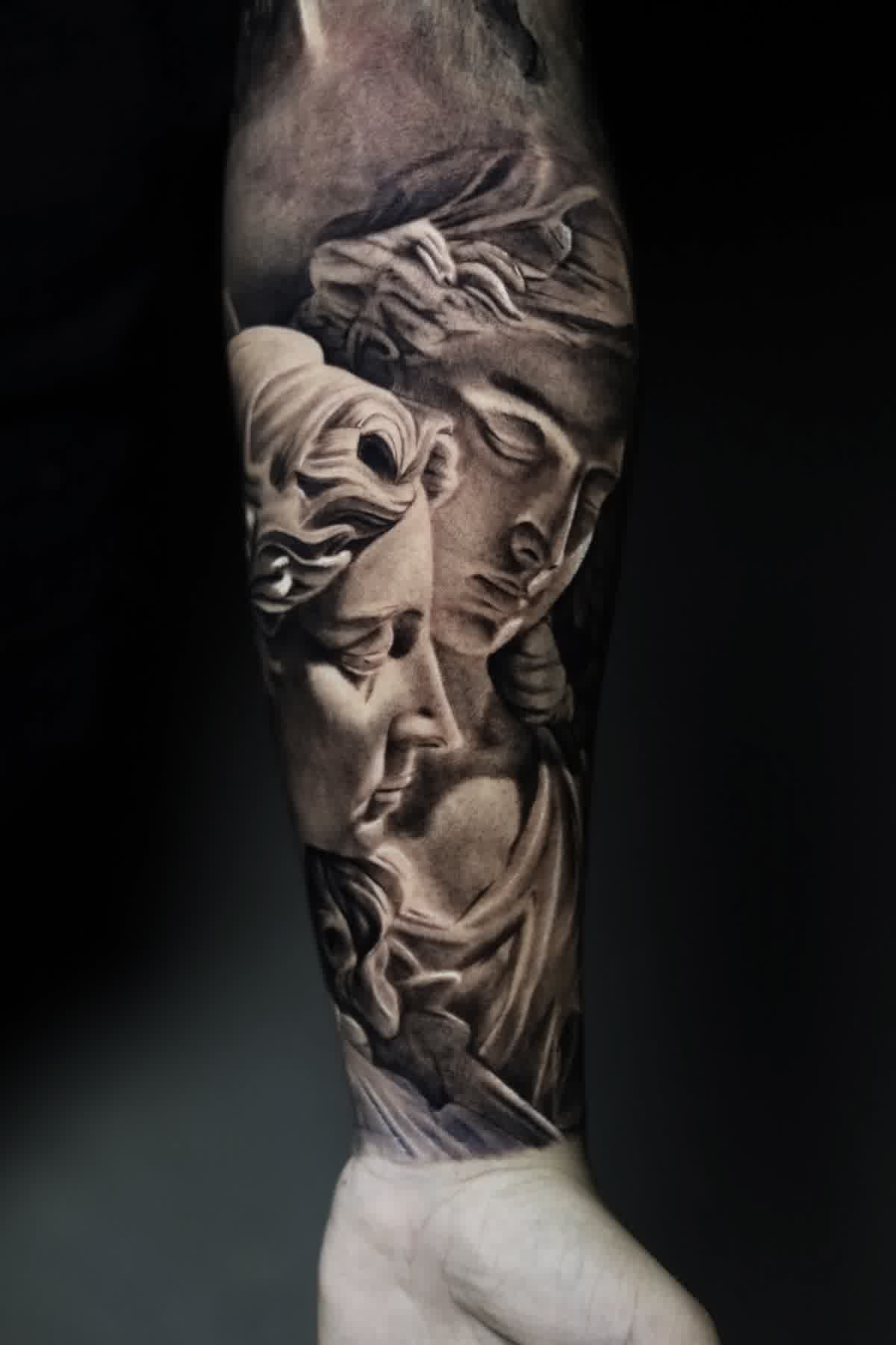 Baran weaves intricate realistic patterns inspired by sacred black and gray, creating hypnotic and timeless pieces.